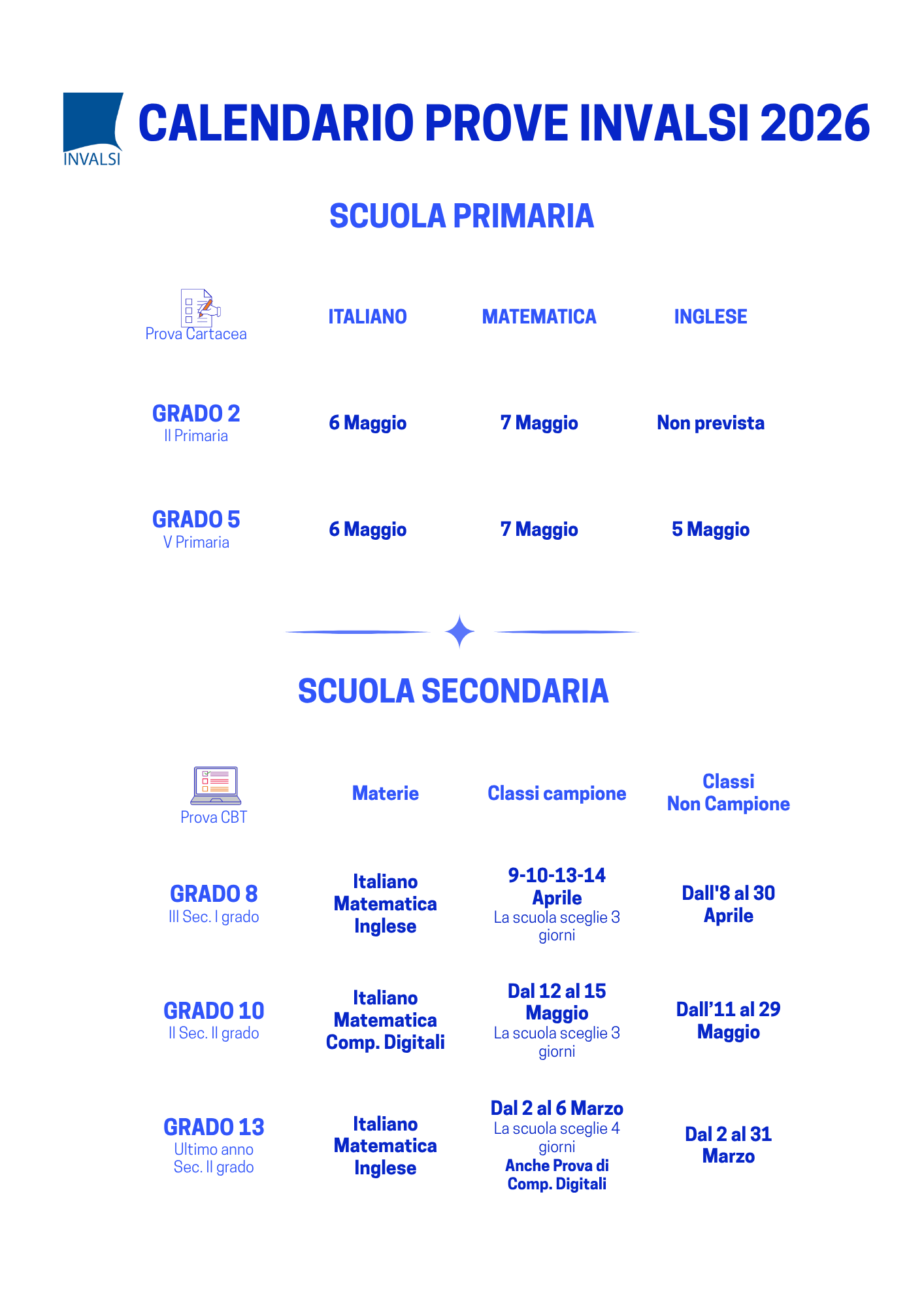 Le classi campione, invece, partecipano alla Rilevazione nazionale nei giorni dal 2 al 6 marzo 2026, in questa finestra la scuola sceglie quattro giorni per svolgere le Prove. Il campione del grado 13 svolge anche la Prova di Competenze Digitali.