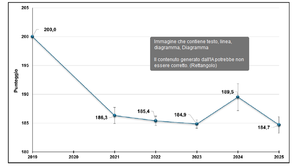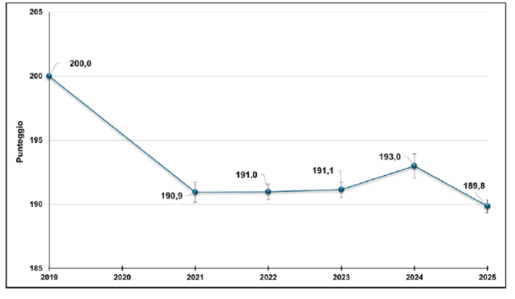 Anche in questo caso, analogamente a quanto si osserva per Italiano, nel confronto con i dati del 2019 (61%) il divario è piuttosto marcato e dopo una lieve risalita nel 2024 (193 punti), il punteggio medio è tornato a ridursi, arrivando a 189,8 punti.
