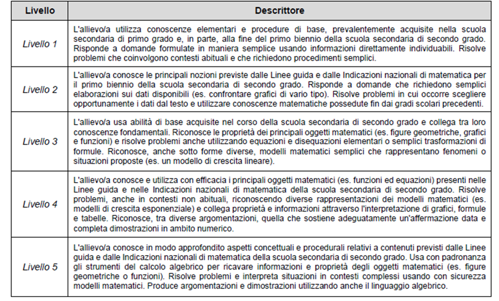 Descrittori dei livelli previsti per la prova di Matematica. Fonte: Rapporto 2025
