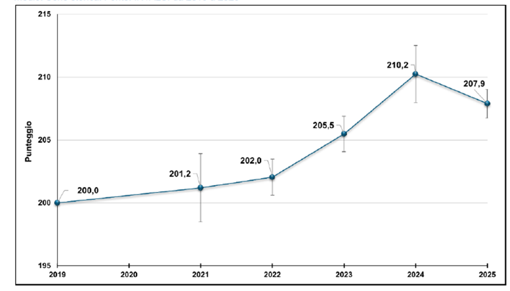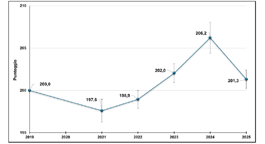 Punteggio medio dei risultati in Italiano. Serie storica. Fonte: Rapporto 2025
