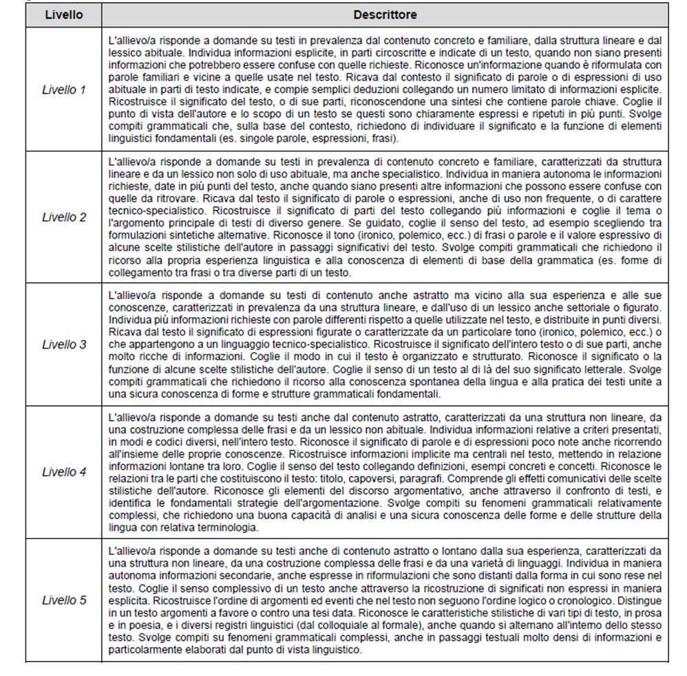 Descrittori dei livelli previsti per la prova di Italiano. Fonte: Rapporto 2025