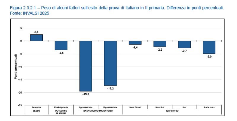 Il background migratorio è un altro fattore che influenza i risultati raggiunti dai bambini e dalle bambine sia in Italiano sia in Matematica, con esiti sensibilmente più bassi per gli immigrati di prima generazione rispetto agli immigrati di seconda generazione e dei non immigrati.