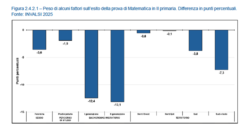 Anche il territorio ha un peso evidente sugli esiti di apprendimento conseguiti nelle due materie al termine della seconda Primaria. A parità dei fattori appena considerati, infatti, i risultati nel Sud e nelle Isole sono inferiori di quelli registrati negli altri territori (-5 punti percentuali per Italiano; -7 punti percentuali per Matematica).