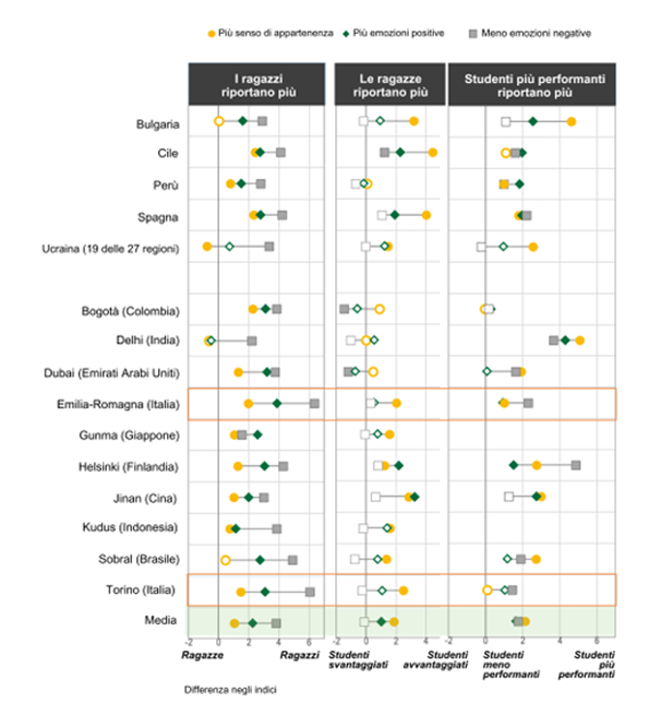 Differenze nel senso di appartenenza e nelle emozioni a scuola. Fonte: OCSE.
